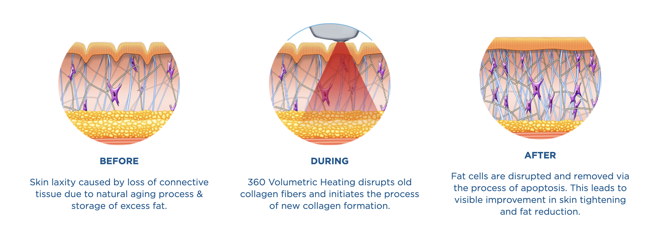 The 360 volumetric heating when used on smaller areas such as the face and neck targets the dermis and epidermis disrupting old collagen fibres and initiating the process of new collagen formation leading to skin tightening. With larger areas the technology employs heat to target and eliminate subcutaneous fat cells and treat cellulite. By heating the fat layer to 43 degrees, the fat cells undergo a process called apoptosis, resulting in the natural elimination of the dead cells via the lymphatic system.